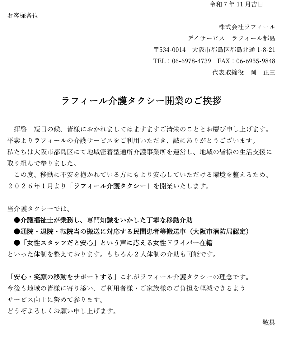 ラフィール都島は"安心と喜び" のご提供と"ご利用者様の気持ち" を第一に考えます。